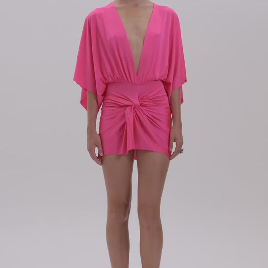 The Fiorenza dress is a captivating piece with a deep V neckline and a seductive open back. Long, flowing kimono sleeves and ruched detailing along the back create a timeless, romantic silhouette full of feminine charm.