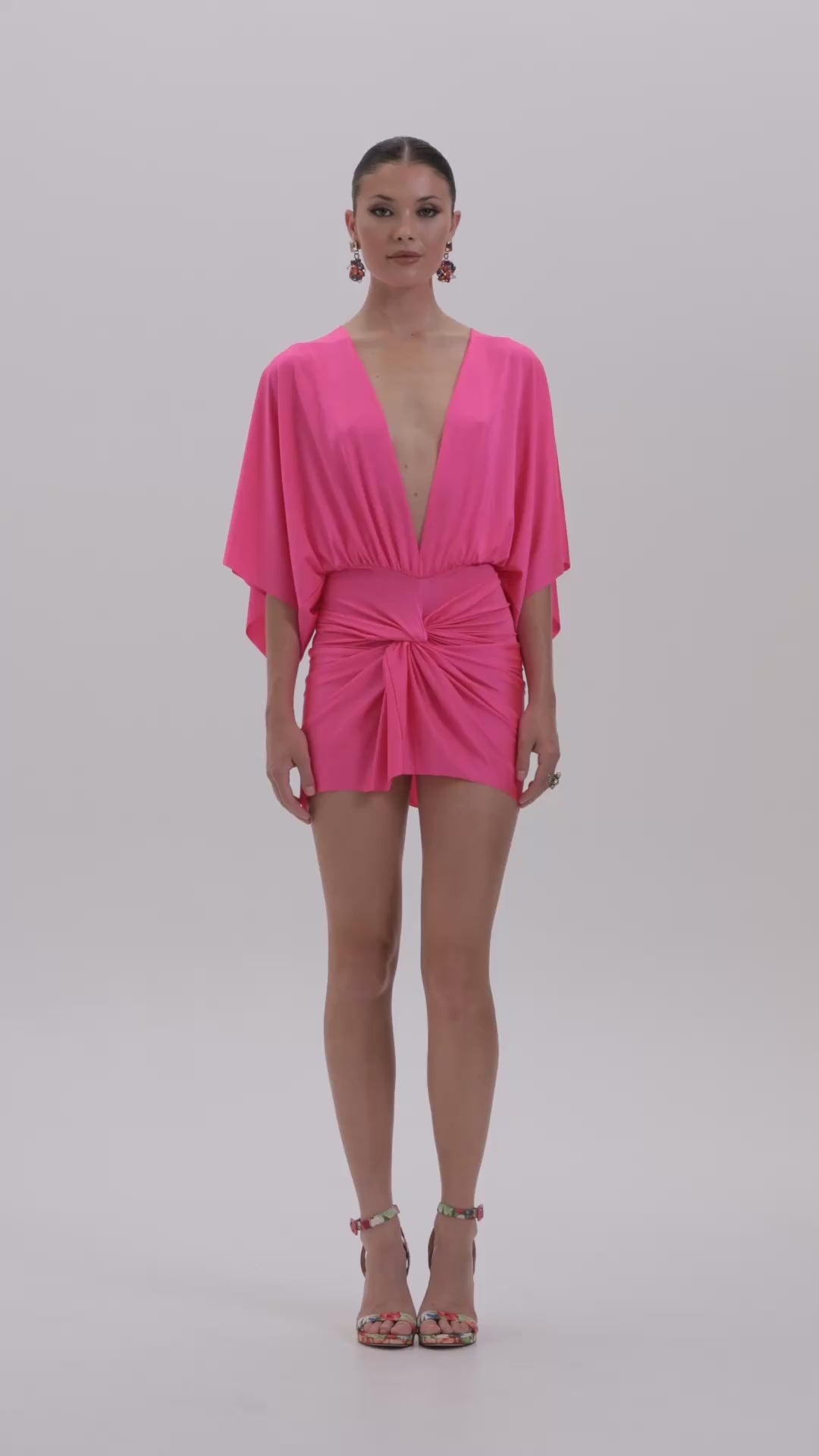 • Deep V neckline • Open back for a sultry touch • Long, elegant kimono sleeves • Ruched detailing along the back